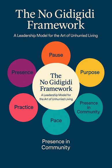 The No Gidigidi Framework is a leadership model rooted in calm intention, cultural wisdom, and the discipline of slowing down. It invites leaders to step away from urgency and reconnect with clarity, presence, and purpose. This framework supports leaders who want to cultivate grounded decision-making, emotional steadiness, and a more intentional pace of work and life.